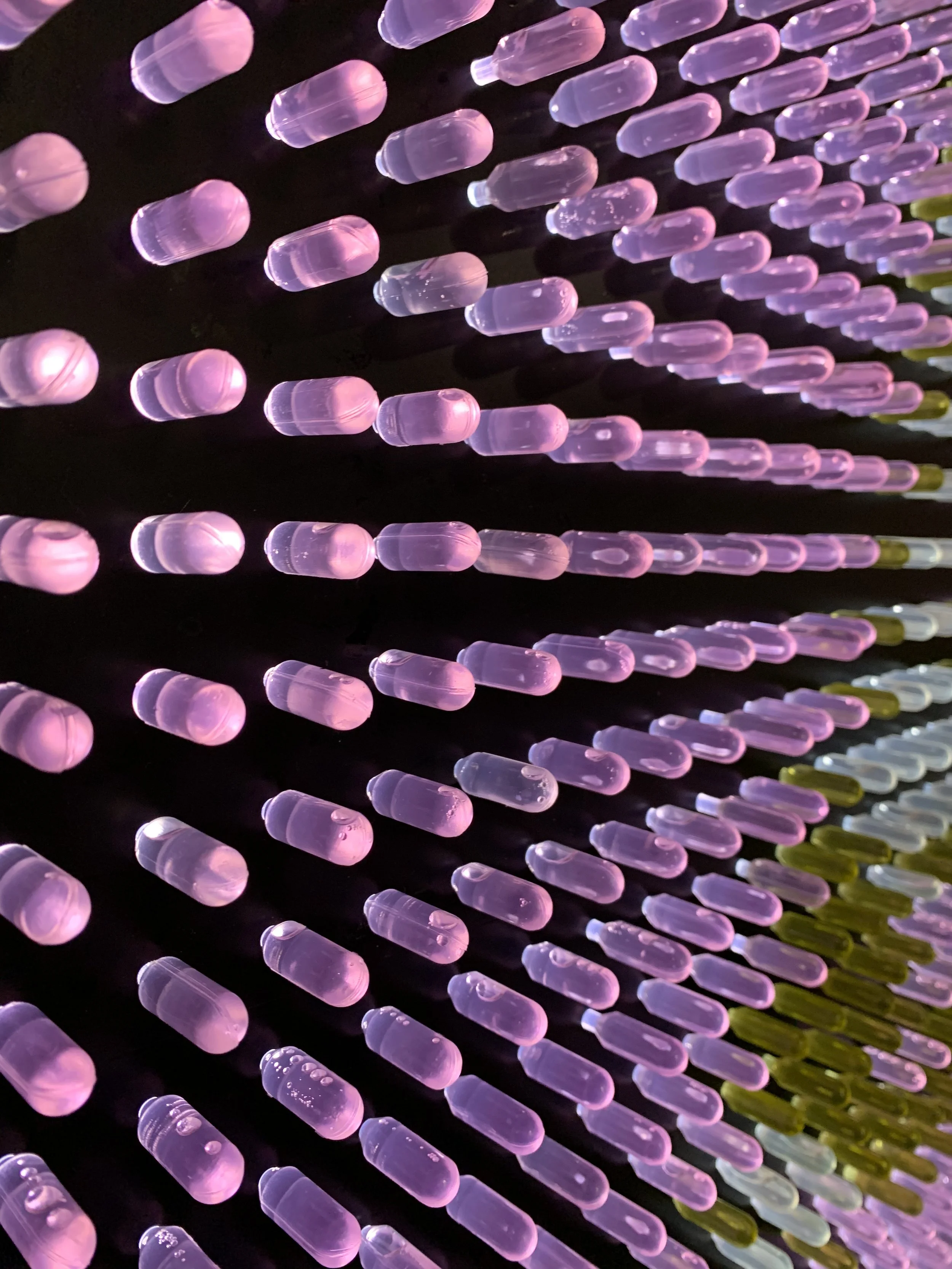 Liquid N Lights is a custom designed consumable art installation. Each "bulb" is colored and filled with flavored drinks. The artist set out to create an idea that was not only interactive and consumable but brought us back to a nostalgic era.